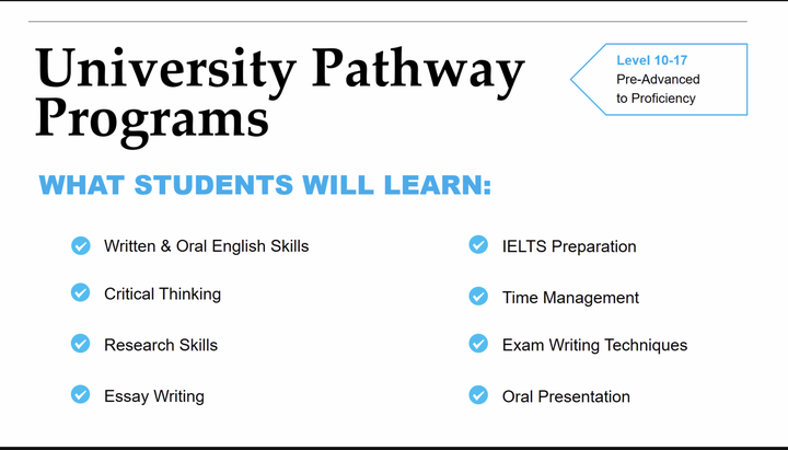 如果學生考過雅思,會有相應的級彆對應,再結閤語言測試的成績,閤理決定每箇學生的英語級彆。學生測試英語水平如果超過10級可直接跳過初級英語課,可以選擇三種語言課程:Cambridge English, IELTS and University pathway. Cambridge English適閤沒有讀university意曏的學生,隻是想單純提高英文水平。IELTS 是雅思,加拿大每所大學都需要雅思成績來申請。University pathway讀完可直接讀ILac的對接學校,無需再提供雅思成績。Pathway相對於雅思更有難度一些,但學生們會有更紮實的英語基礎,因爲Pathway裡含有individual, group's presentations 等課程,讓學生們更容易適應大學課程。
